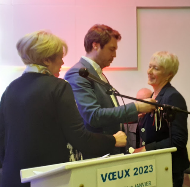 C'est donc avec une salle des fêtes pleine que les voeux se sont déroulés, mais pas que, en effet, des médailles de travail du département ont été remises. Pascal DETIENNE au poste technique a reçu la médaille par Fabien. Pascale GRUNY a remis la médaille du travail au service des collectivités en tant qu'élus durant 20 ans aux adjoints Chantal ZIMMERMANN, Georges MARTINEZ, au conseiller municipal Jean LETRILLART et pour finir au Maire Fabien BLONDEL.
